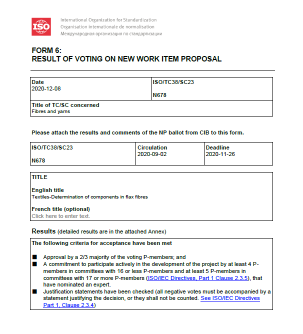2020年12月8日,ISO/TC38/SC23(国际标准化组织/纺织品技术委员会/纤维和纱线分技术委员会)秘书处下发N678号文件,正式确认东华大学牵头提交的国际标准新工作项目提案“Textiles – Determination of components in flax fibres”,通过3个月的投票达到立项要求,获得立项,编号为ISO/NP 5773。本标准由我校纺织检测中心李卫东教授级高工任项目负责人,研制时间预计为3年。