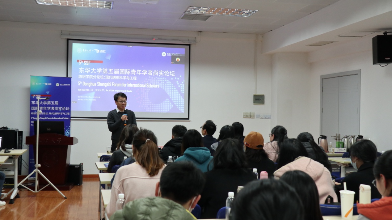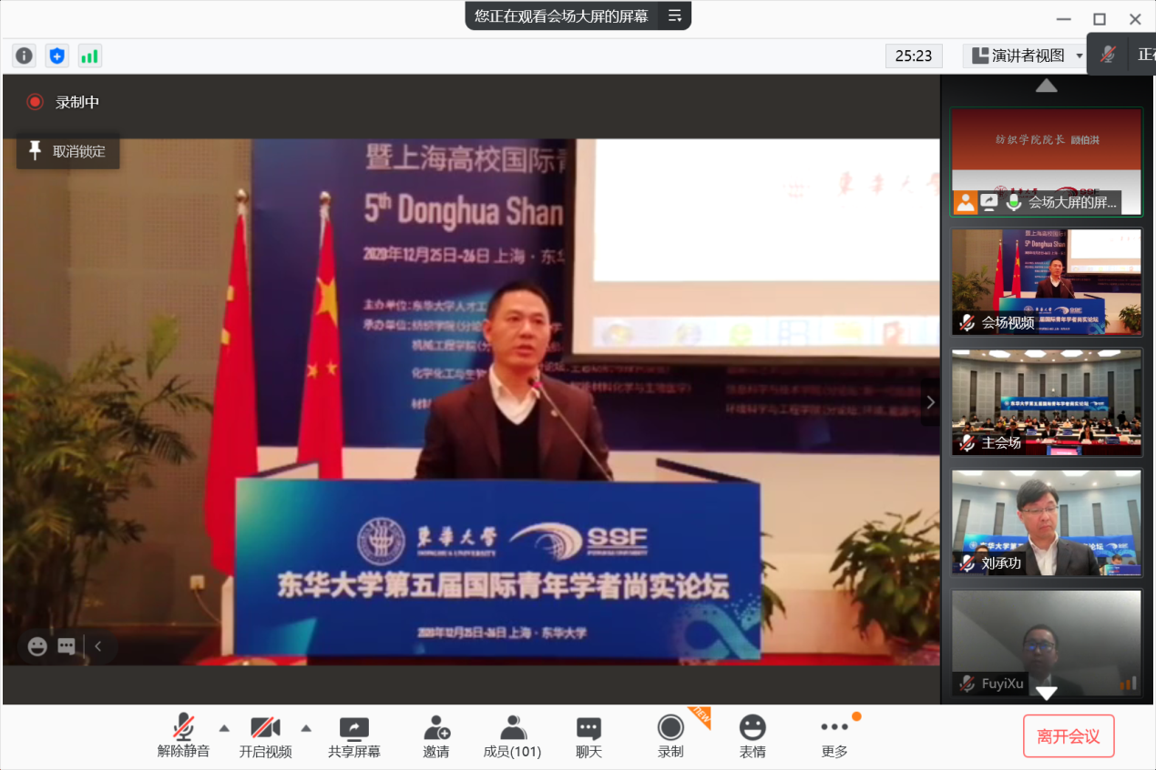 12月26日下午5:00,东华大学第五届国际青年学者尚实论坛“现代纺织科学与工程”分论坛在金沙js3833楼3004会议室举行,本次分论坛分为线上线下同步举行。金沙js3833党委书记李成龙,副院长王富军,副院长许福军,各系系主任及学生共计100余人参加了本次分论坛。