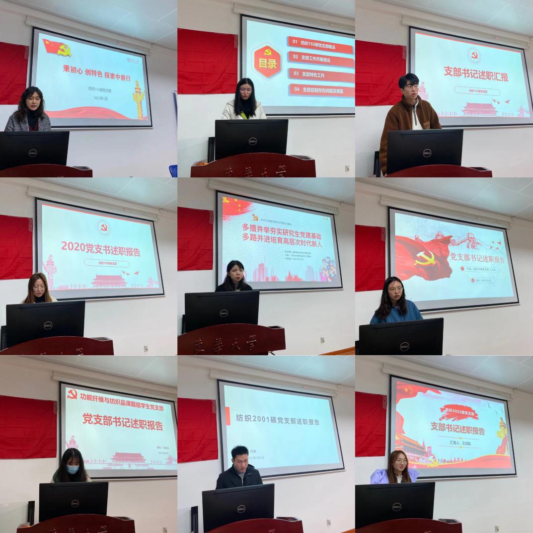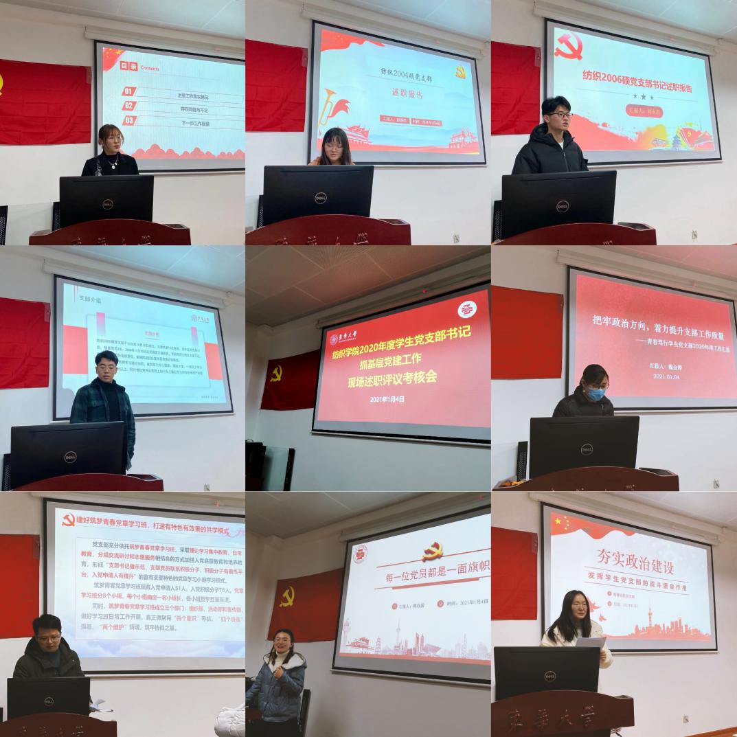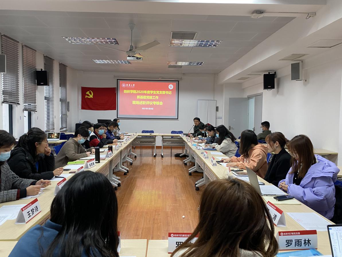 为全面贯彻落实习近平新时代中国特色社会主义思想,深入贯彻落实新时代党的建设总要求,进一步推动全面从严治党向基层延伸,切实增强党支部书记抓基层党建的主责意识,扎实有序推进基层党建工作质量提升,按照《东华大学2020年度党组织书记抓基层党建工作述职评议考核工作实施方案》精神和学校党委年度工作部署,2021年1月4日,东华大学金沙js3833党委召开2020年度学生党支部书记抓基层党建工作现场述职评议考核会。学院专职党务干部寿晨燕和学院全体学生党支部书记参加会议。