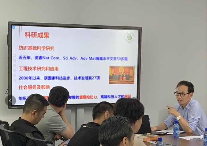 下午,参访团出席了由东华大学国家大学科技园牵头举办的“东华大学纺织、新材料科技成果发布暨企业技术需求对接会”。会上,王富军教授介绍了学院架构、培养目标、科研能力、学科平台、国际交流、科研成果等总体情况。之后,胡吉永教授对智能可穿戴纺织品用于医疗、信息通讯、传感技术、柔性能量储存装置做了详细讲解。付少举老师展示了针织的最新研究成果,该成果使毛线产品版型更加美观,细节更加精准,无需重复打样,形成规范化、标准化的针织服装设计、工艺、制版体系。