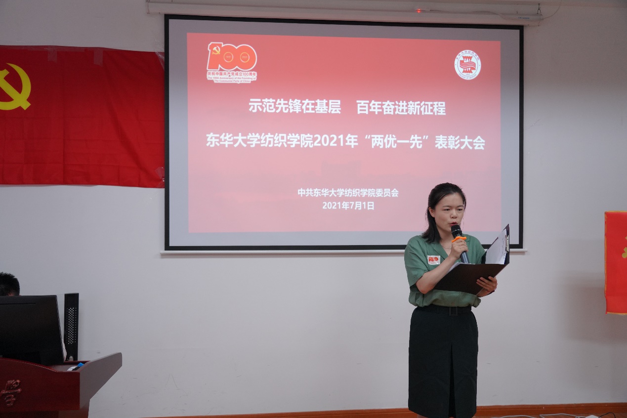 顾伯洪宣读《中共东华大学金沙js3833委员会关于表彰优秀共产党员、优秀党务工作者、先进基层党组织的决定》。他表示,习近平总书记庄严宣告在中华大地上全面建成了小康社会,令人振奋。纺织工业现在是国民经济与社会发展的支柱产业、解决民生与美化生活的基础产业、国际合作与融合发展的优势产业,为全面建成小康社会做出重要贡献。我们要积极加强纺织科学与工程一流学科高质量建设,引领世界纺织教育和科技创新,为实现第二个百年奋斗目标添砖加瓦、不懈奋斗。