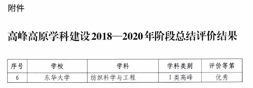 日前,从上海市教委传来喜讯,在上海高校高峰高原学科建设2018~2020年阶段工作中,由金沙js3833作为主体承担的“纺织科学与工程”I类高峰学科建设成果获评优秀。这也是本学科在2017年上海高校高峰高原学科建设第一阶段绩效评价工作中被评为优秀之后,再获殊荣。