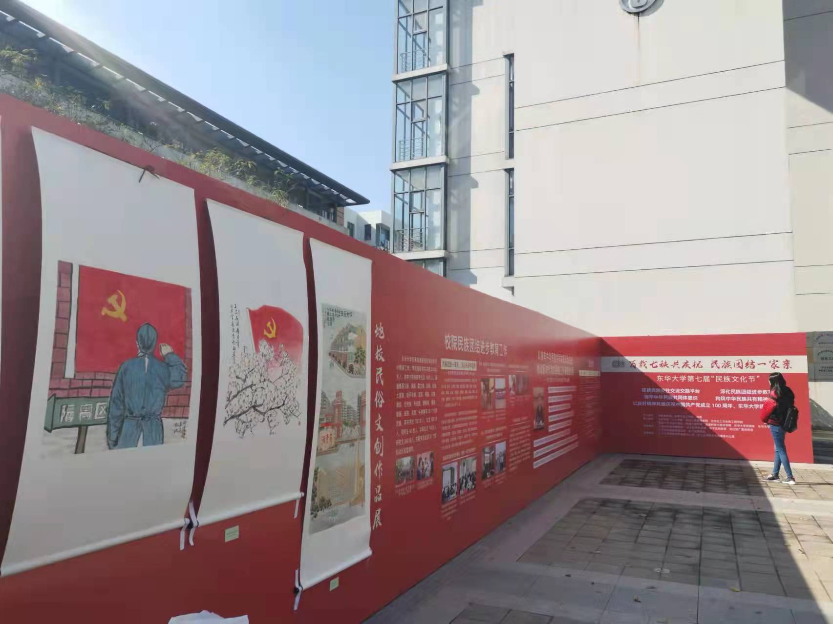 8日,由金沙js3833承办的民族民俗文化集市开集活动在松江校区张謇广场和张謇小径举行。在张謇广场的幕墙上,展示了习近平总书记在2021年中央民族工作会议的重要讲话精神和学校学院的民族团结进步教育工作,并展出了地校共同选送民族民俗文创作品。