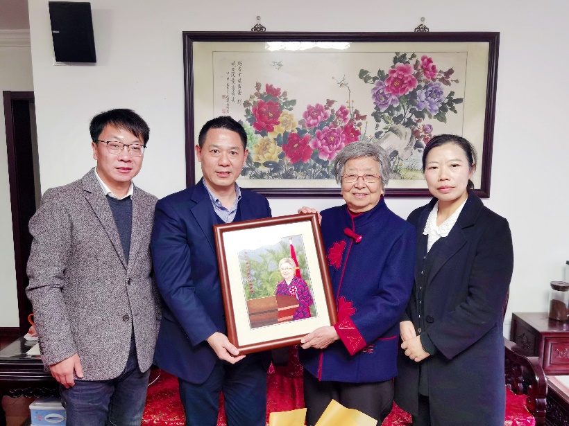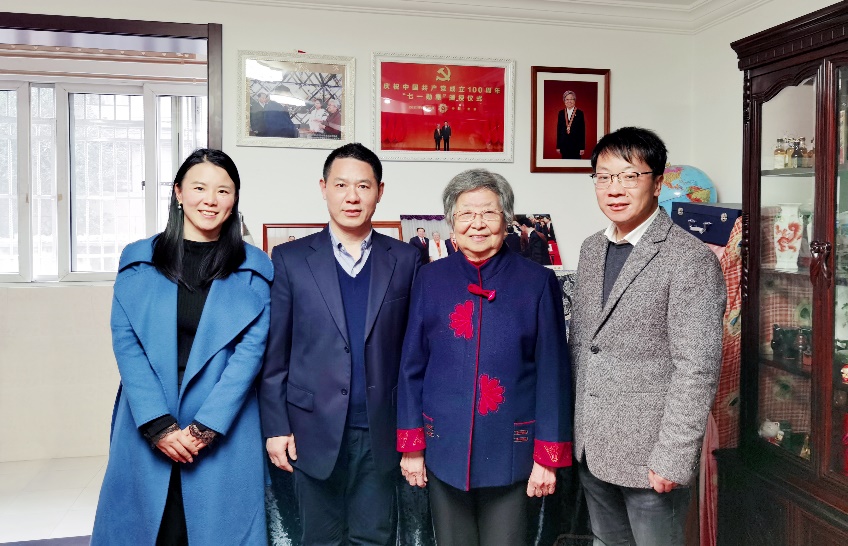 12月10日下午,金沙js3833党委书记李成龙、院长顾伯洪、出版社总编辑周德红和学院办公室主任章倩一行看望“七一勋章”获得者、金沙js3833杰出校友黄宝妹。