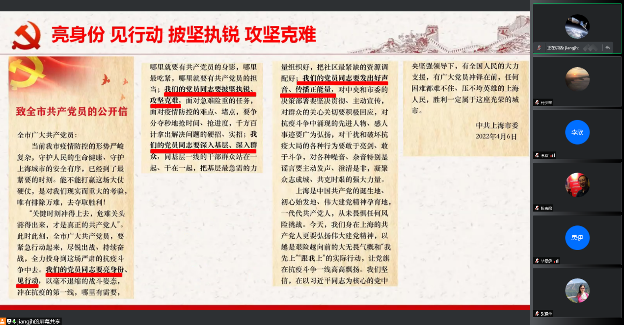 系列专题会议为进一步讲清楚上海的疫情防控形势和政策、讲清楚本校的防控形势和政策、讲清楚党支部和党员的责任和义务奠定了思想基础和组织保证。会议要求广大学院支部和党员做到“三个坚持”,希望各基层党支部发挥战斗堡垒作用,带领全体教师在统筹做好疫情防控的前提上,有序顺利推进学院人才培养、科学研究等各项工作。