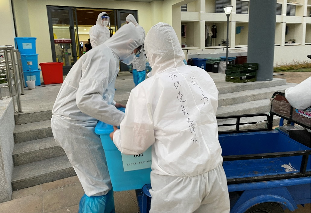 (由教师党员组成的“纺织党员先锋队”正在为松江校区学生送餐)