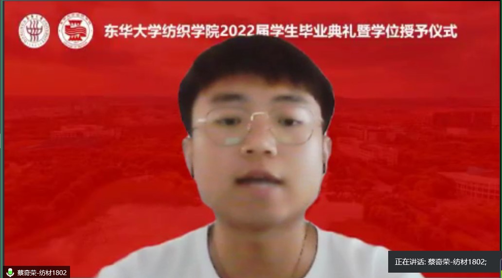 纺硕2005班潘真祯、纺材1802班蔡奇荣和医用纺材1801班张慧敏作为毕业生代表分别发言,他们表达了对母校培育、良师教诲、同学情谊的感恩,纷纷表示毕业后不论身处何地都不忘学校和学院的期许,努力提升自我,在自己的青春赛道上脚踏实地、奋勇争先。卓越纺织1901班李娜作为在校生代表发言,她感谢众多优秀学姐学长的帮助和相遇,也祝福所有毕业生前途光明、鹏程万里。