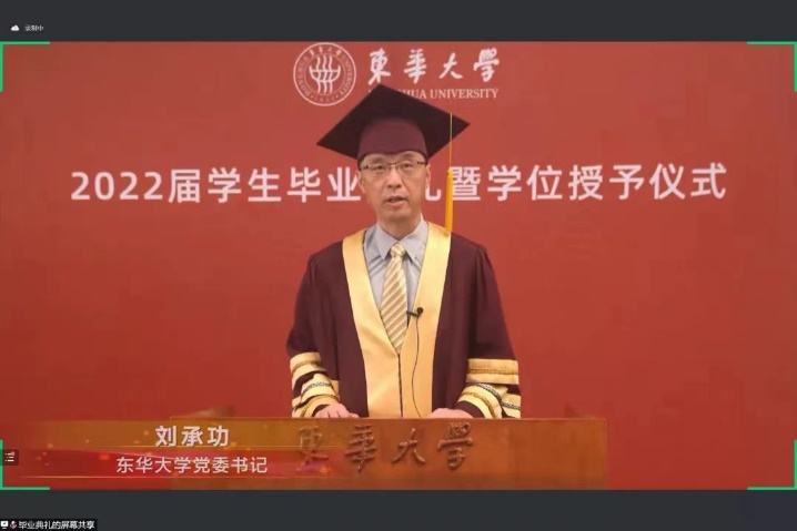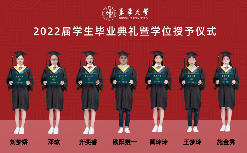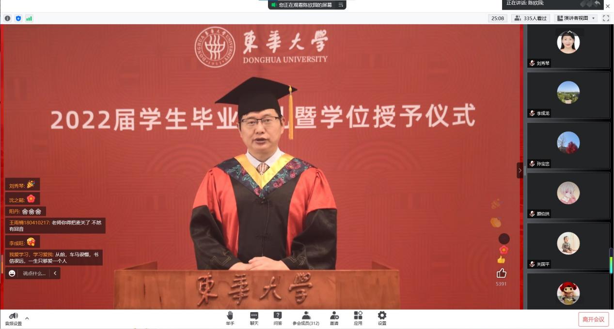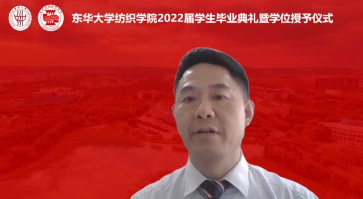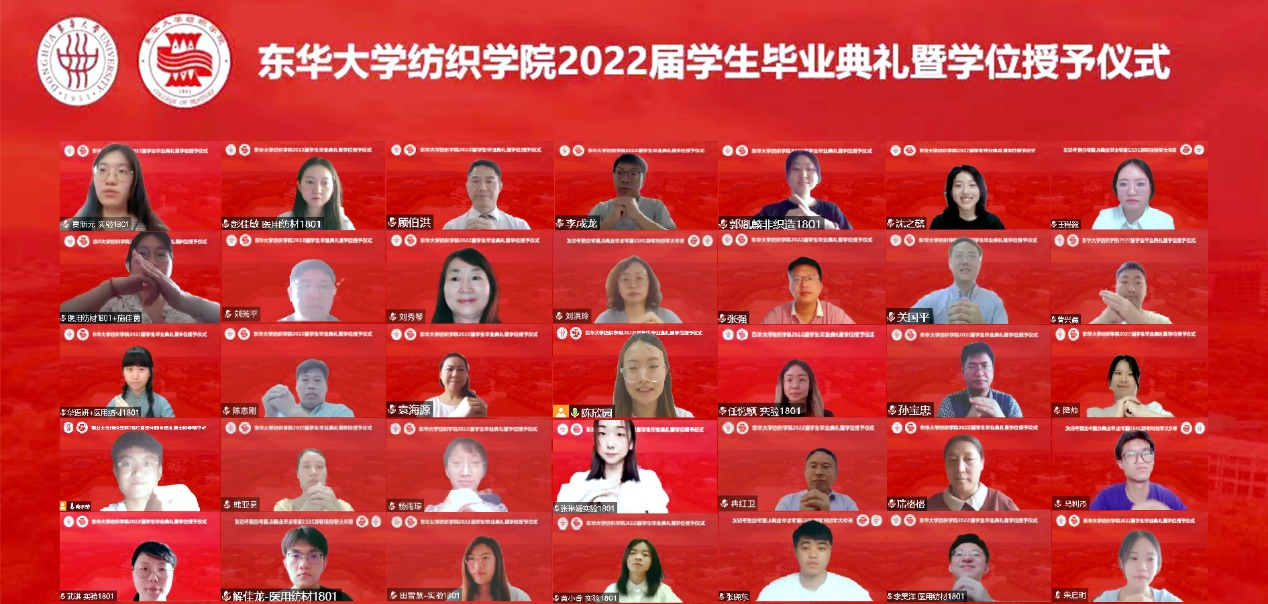 6月22日上午,东华大学金沙js38332022届学生毕业典礼暨学位授予仪式于线上隆重举行。毕业典礼分为学校会场与学院会场。东华大学党委书记刘承功,校长、中国工程院院士俞建勇,副校长舒慧生,校学位评定委员会秘书长、研究生院常务副院长俞昊出席毕业典礼学校会场。金沙js3833党委书记李成龙,院长顾伯洪,党委副书记陈志刚,副院长许福军,各系部主任、教师代表,辅导员老师和毕业学生相聚毕业典礼学院会场云端,分享毕业的喜悦,共话未来的期盼。学院会场由毕业班年级组长陈欣园主持。