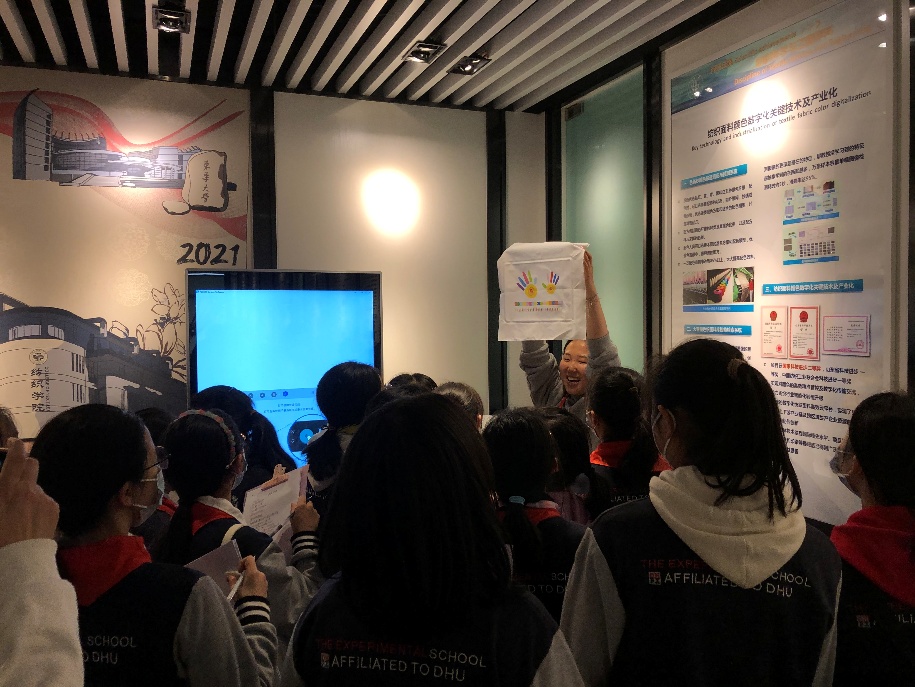 一流学科展示区利用220平方米展厅全方位展现了东华大学一流纺织学科的概况和发展历程,陈列展品近百件,支部党员分工明确,积极配合各版块负责老师展开志愿服务。支部党员利用岗位优势一一讲解,向东华附校学生解读党建、科技和创新工作,为学子绘就“纺织创新与科技强国梦”;数码印花机一角,支部党员通过介绍纺织印花工艺,展示文创产品及帆布袋、印花T恤的现场手工体验等形式,为东华附校学生带来零距离接触体验,全方位体会纺织魅力。纺织一流学科展厅浓厚的学术氛围将助力于东华附校学生成长。